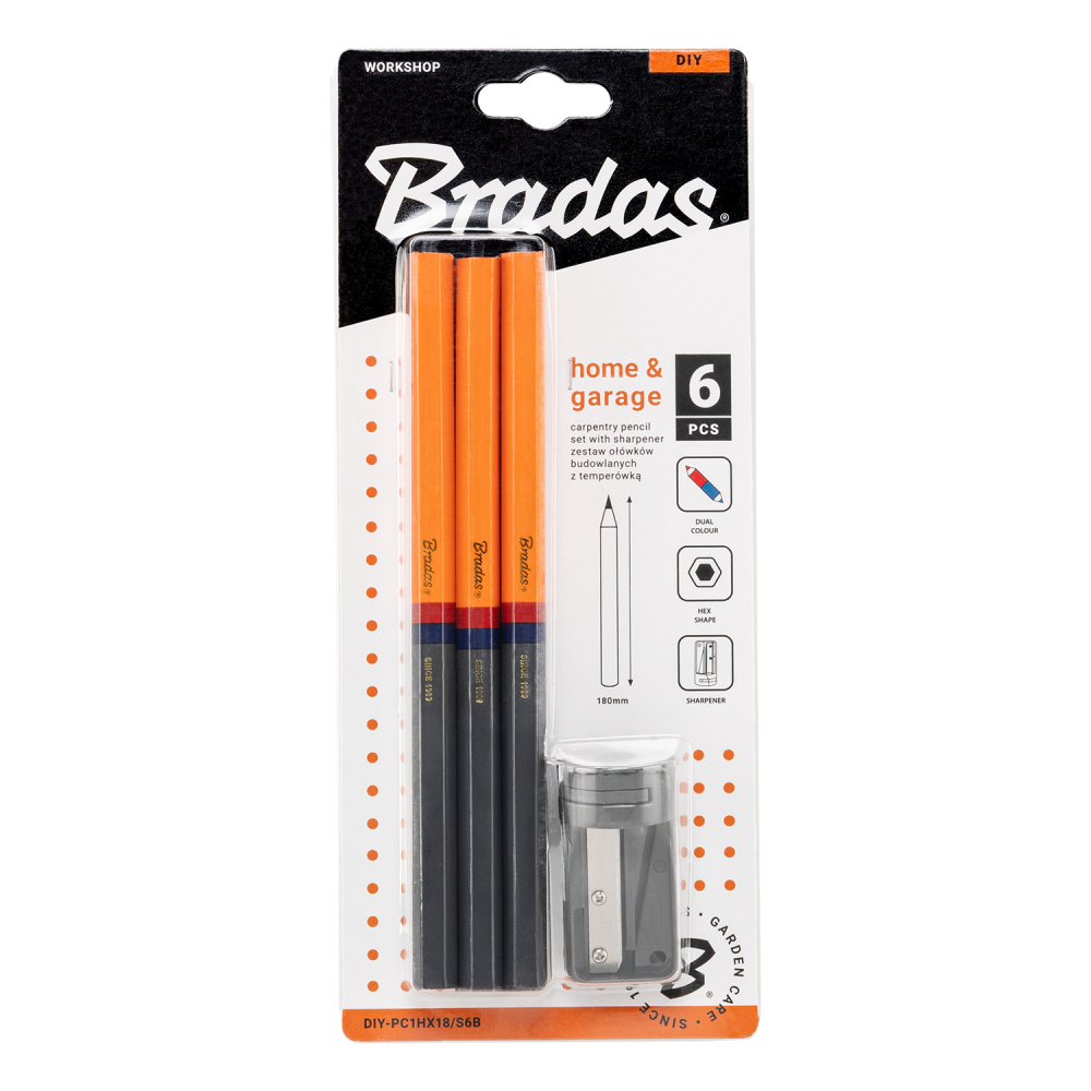 De Bradas timmermanspotloodset 180 mm bevat 6 stevige potloden met een zeskantige vorm en wordt geleverd met een universele puntenslijper – ideaal voor vakmensen in de bouw en houtbewerking.