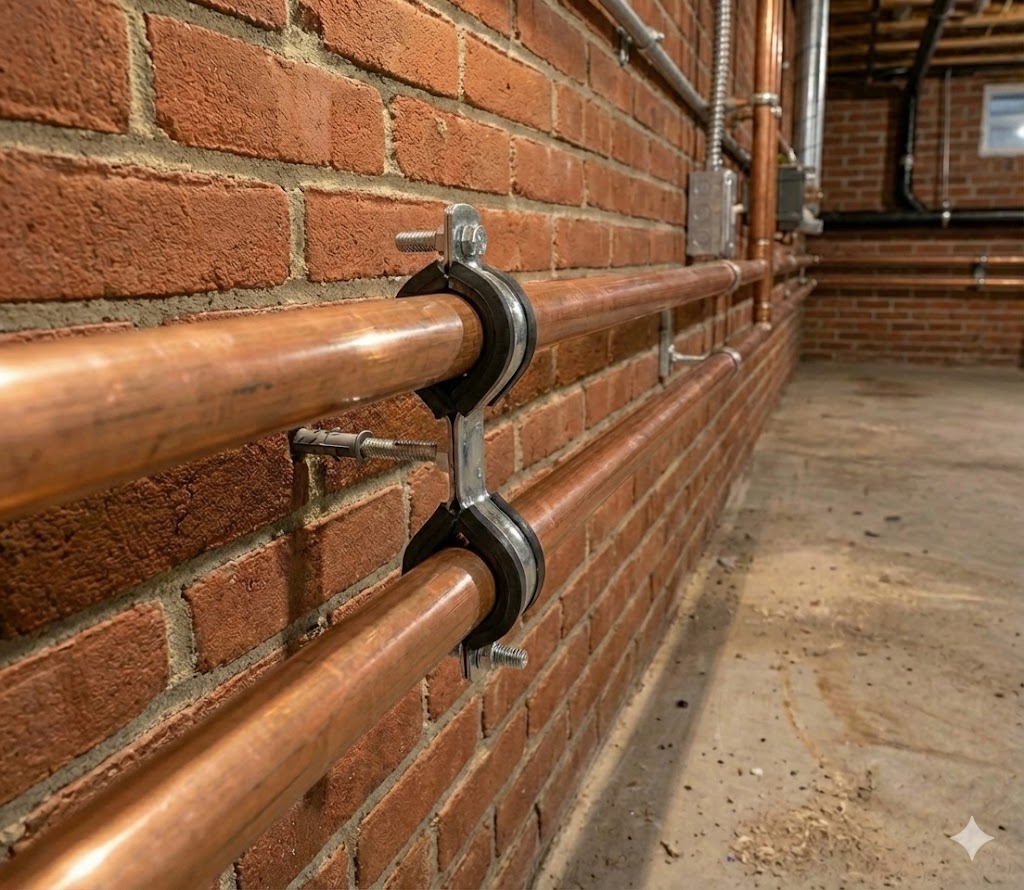 De Diamond dubbele buisklem met beschermende EPDM-inlage en schroefpen is ontworpen voor het professioneel bevestigen van dubbele leidinginstallaties aan muren of plafonds – met extra demping en duurzaamheid.