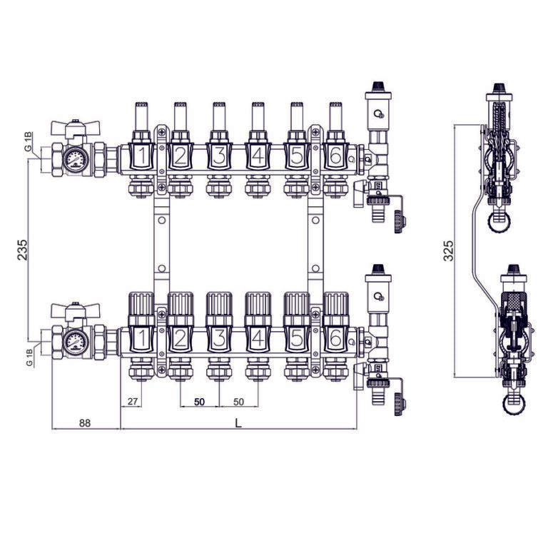 Complete vloerverwarming verdeler met alles erop en eraan – klaar voor directe aansluiting op PEX 16 leidingen.