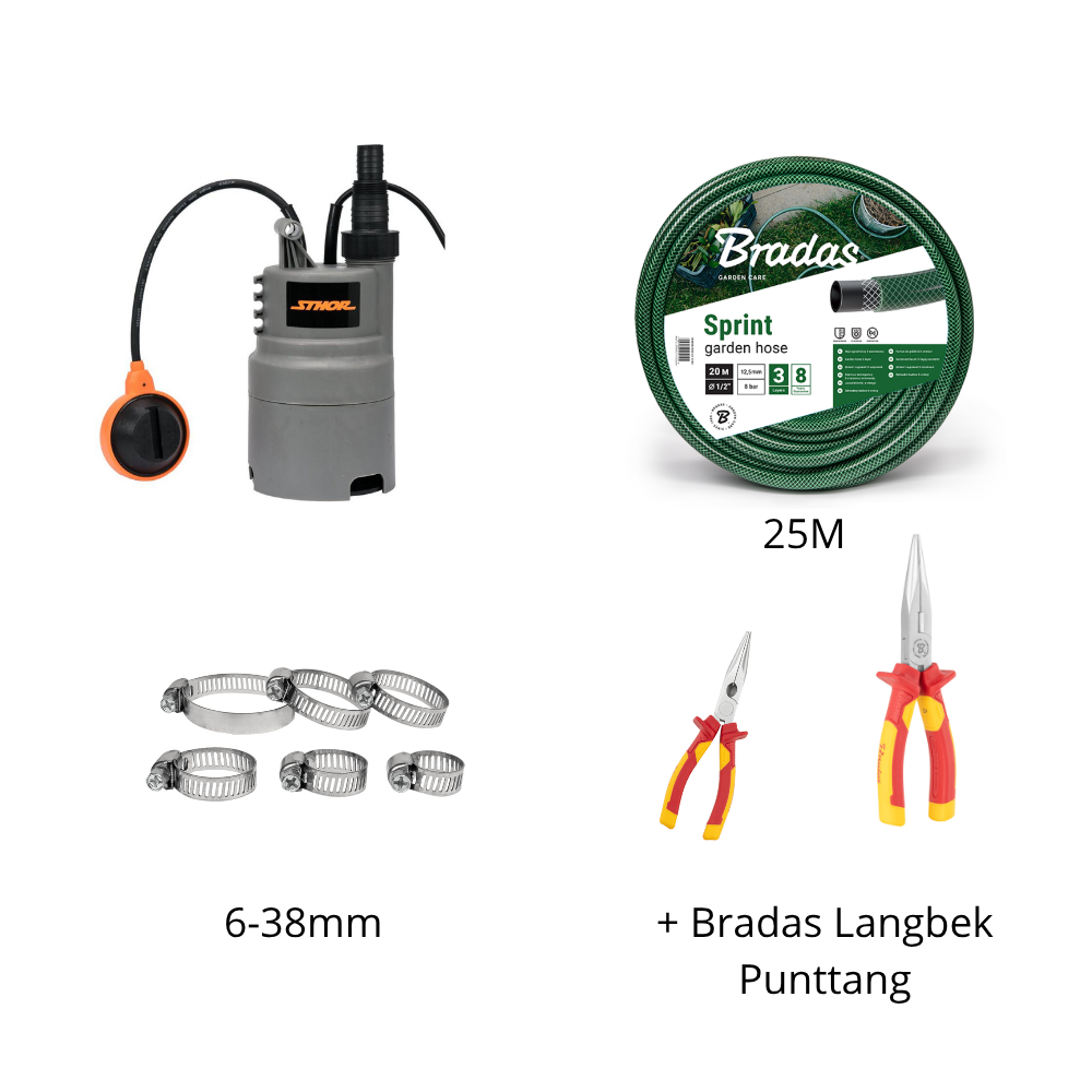 Dompelpomp Vuil Water 400W Set – Sthor + Bradas SPRINT 1" slang 25 m + RVS slangklemmen + VDE punttang
