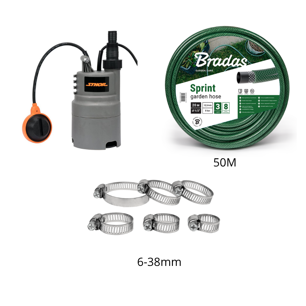 Dompelpomp Vuil Water 400W Set – Sthor + Bradas Tuinslang SPRINT 25 mm (1") 50 m + RVS slangklemmen