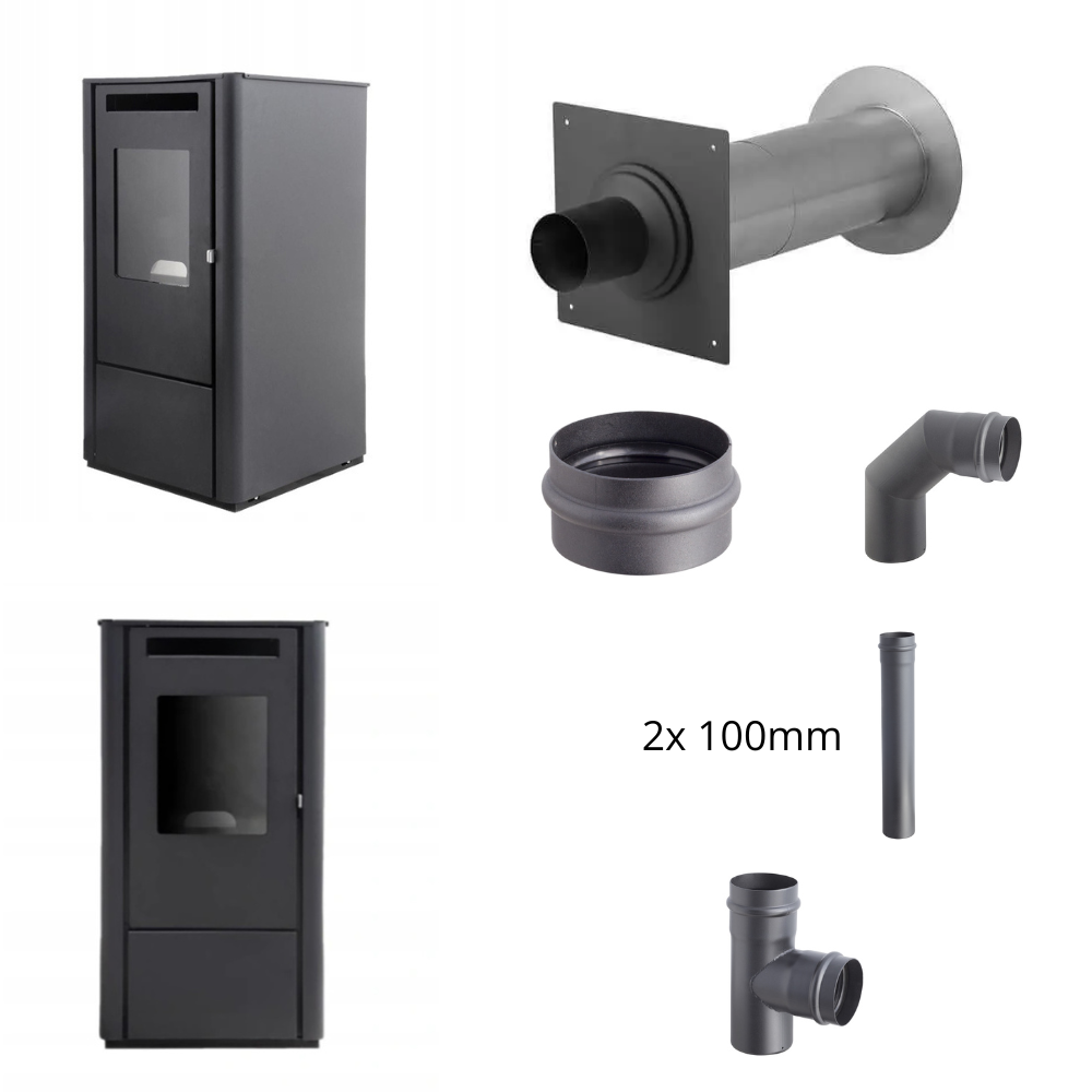 Compleet verwarmingspakket met stijl: Ferretti Milano 9kW pelletkachel + zwarte geveldoorvoer + Darco SPKP Ø80 afvoerset.