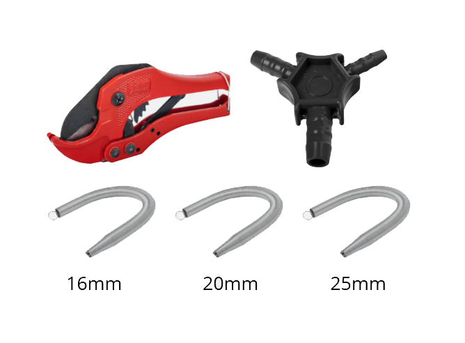 Dankzij de drie meegeleverde inwendige buigveren (16, 20 en 25 mm) buig je meerlagenbuizen netjes en zonder knikken in de gewenste radius, wat bochtenfittingen overbodig maakt. Zo werk je sneller, zuiniger én betrouwbaarder.