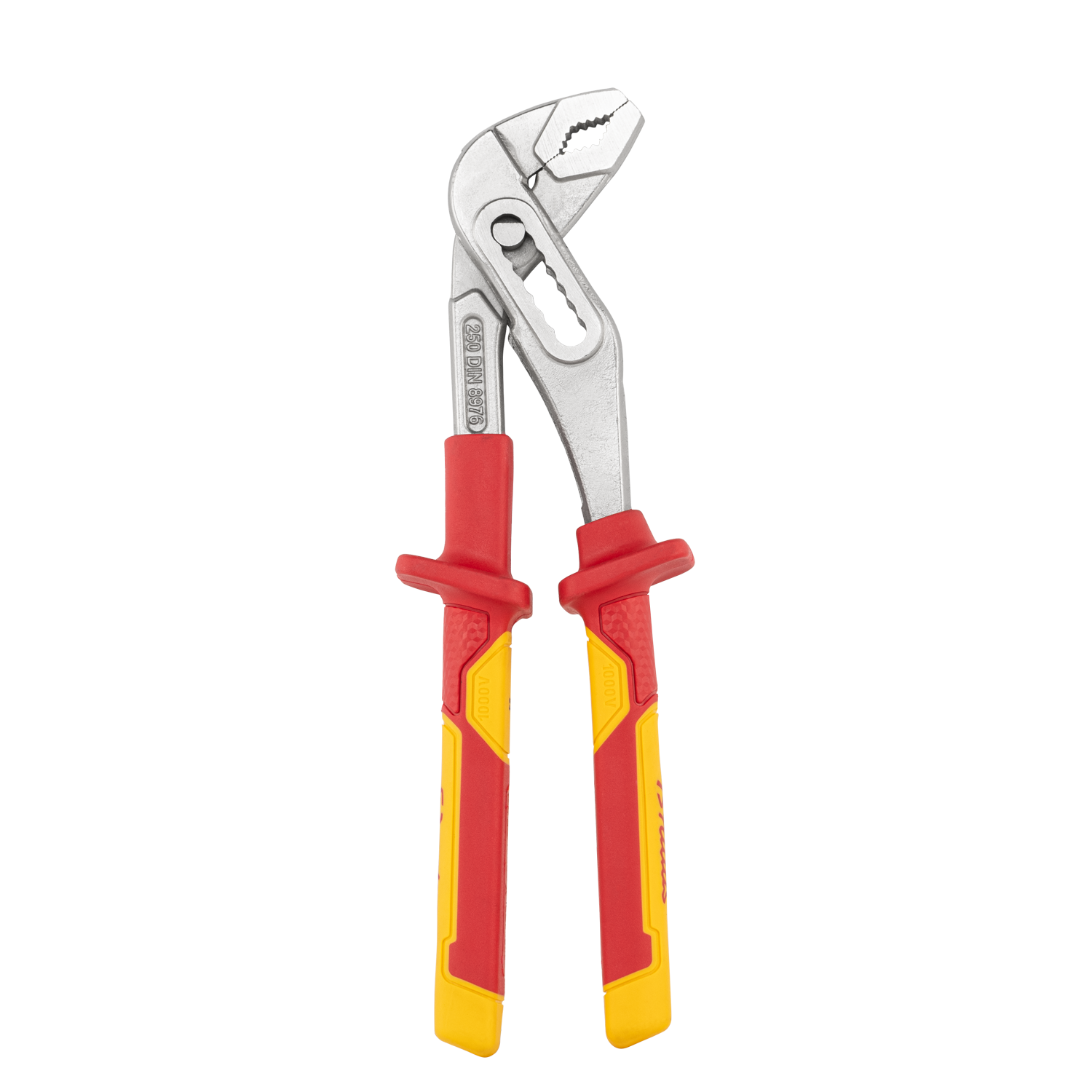 Je krijgt vier VDE-geïsoleerde tangen voor alle elektrotaken: langbek-, zijknip-, combi- en afstriptang. Elke tang is getest tot 1000V conform IEC 60900 – zodat je veilig kunt werken aan schakelkasten, groepenkasten en bedrading. De extra waterpomptang (250 mm) met softgrip is ideaal voor klemmen, moeren of koppelingen – ook in vochtige omgevingen.