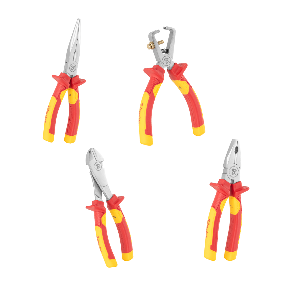 VDE Tangenset 1kV – Bradas Langbek 195 mm, Zijkniptang 195 mm, Combinatietang 185 mm & Afstriptang 165 mm (geïsoleerd)